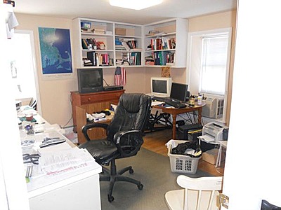 9) The next few photos are in a really beautiful, upscale home. At least the first floor is really beautiful but somehow the upstairs was just a forgotten wasteland. This office could be nice if it was straightened up and decluttered. This just says "chaos"and not organized and efficient - that's what you want to portray when you are selling your home with an office in it.